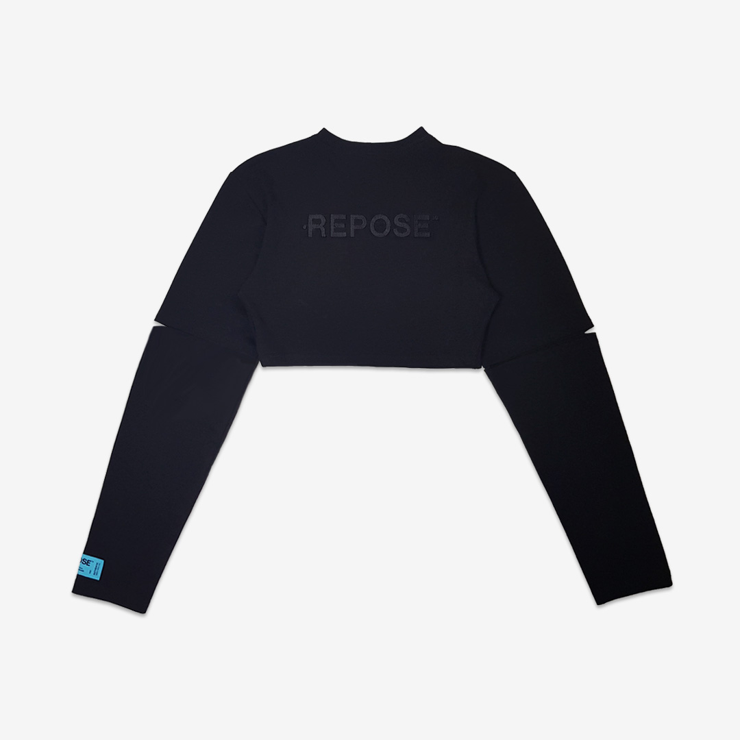 An uniquely styled minimalism crop top with black logo on black fabric. Double layer cut long sleeves, with mid high neck to create classiness vibes. REPOSE JAPAN All Season 2023 Women collection debut. Made with 100% premium spandex cotton, 220gm pre-shrunk material. Release on 30 Dec 2022.